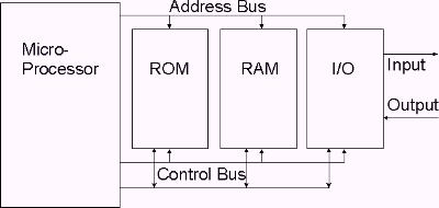 Here the ROM section would contain the read only memory, while the RWM contains Read Write Memory. There are two main type of RWM memory, including RAM and sequential access memory. Ram is the key memory where we store the data that we are working on, while sequential access memory is memory like a magnetic tape, or CD-Rom Disc. In both of these types of memory, the data location is represented by a binary address. This address is how we are able to get into the contents of the memory by calling its address through our address bus. The I/O section is our input output section that lets us talk to the rest of the universe, as well as receive input.
